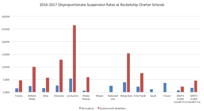 Now consider the disproportionate suspension rates of students with disabilities at Rocketship schools. The chain’s marketing and promotional materials laud low rates overall, but the patterns of students getting suspended are revealing and corroborate concerns about differential treatment and high rates of push-out of students with special needs.